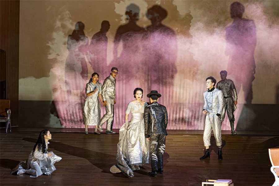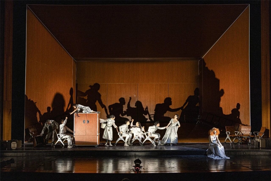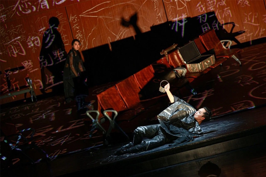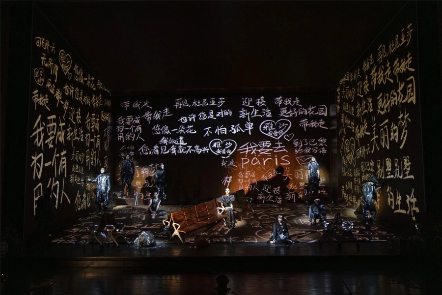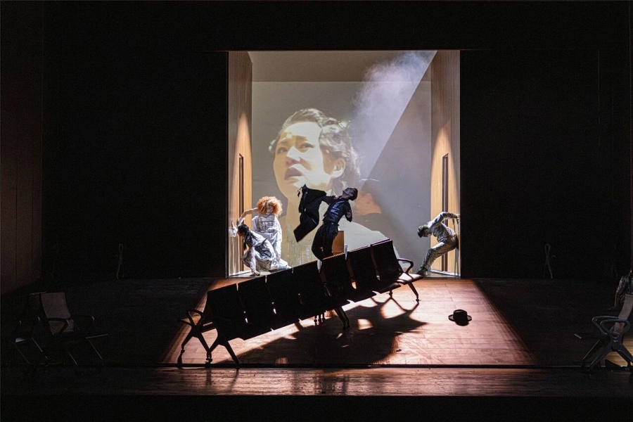 在这些带有先锋性质的舞台调度之外,导演还从文本的改编重塑中挖掘原作的“当代性”,他“将掩藏于原作中的诸多线索清晰展示”,尤其是增加了部分角色之间的感情戏码,突出人物的情欲。或许,在导演的构想中,这种处理意在通过为人物增添道德上的暧昧性,勾勒人性的复杂层次,或借助更为外在、可见的欲望冲突,呈现人物内心的苦闷与彷徨。值得商榷的是,这是否使得人物的重心发生了位移?角色原本所承载的、在不可逆转的新旧更替面前所体现出的不同处世哲学与人生态度,是否退居到情感纠葛所构成的戏剧冲突之后?